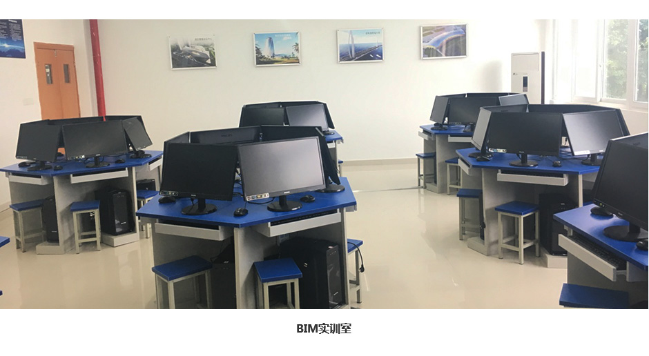 我校建设有4间高配置BIM实训室,可以同时容纳200人进行实训。每间建筑信息模型(BIM)实训室配备43台高性能工作站电脑,配置Revit平台、广联达平台、鲁班平台的相关BIM建模软件、BIM管理软件、BIM造价软件、BIM可视化软件,形成了一个完整的实训系统。