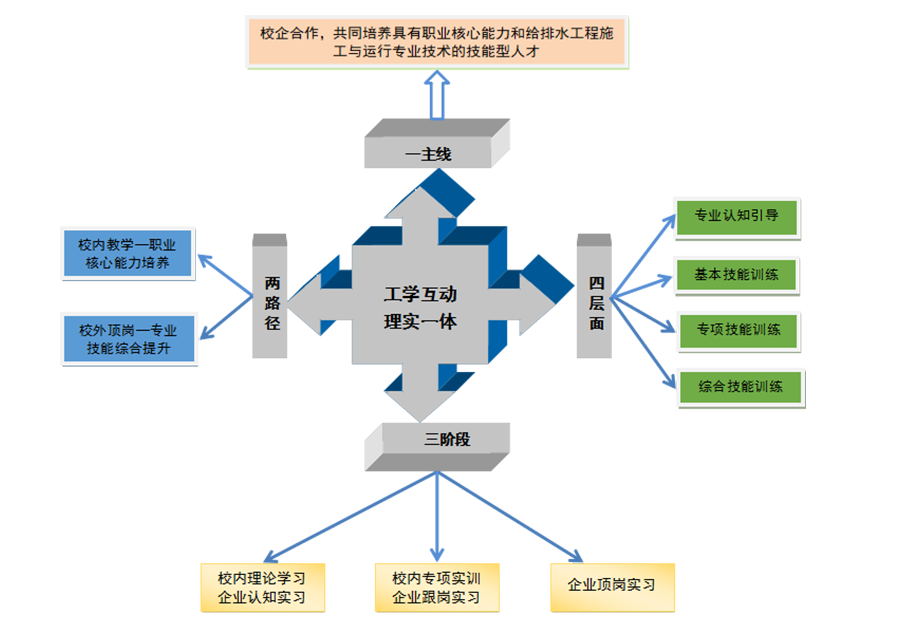 一主线:是指学校以市场为导向,以市政行业岗位需求为目标。抓牢中职生能力定位,培养具有给排水工程施工与运行能力的技术人才。